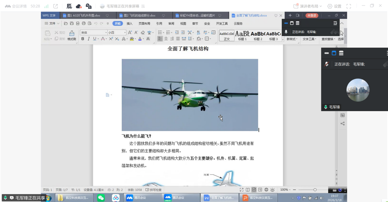 立足南航“三航”特色,毛老师以航空发展简史为引,带领同学们在历史脉络中感受航空科技与翻译工作的深层关联。从中国古代风筝、孔明灯到欧洲热气球载人升空,从莱特兄弟动力飞行到世界首架喷气式飞机问世,毛老师以关键节点串起人类翱翔蓝天的探索历程。在中国航空发展部分,他特别强调了1909年冯如首飞、1954年新中国首架自制飞机成功试飞、以及近年C919大型客机等标志性成果,指出中国航空工业跨越式发展的背后,离不开科技翻译工作者在技术引进与国际合作中发挥的桥梁作用。